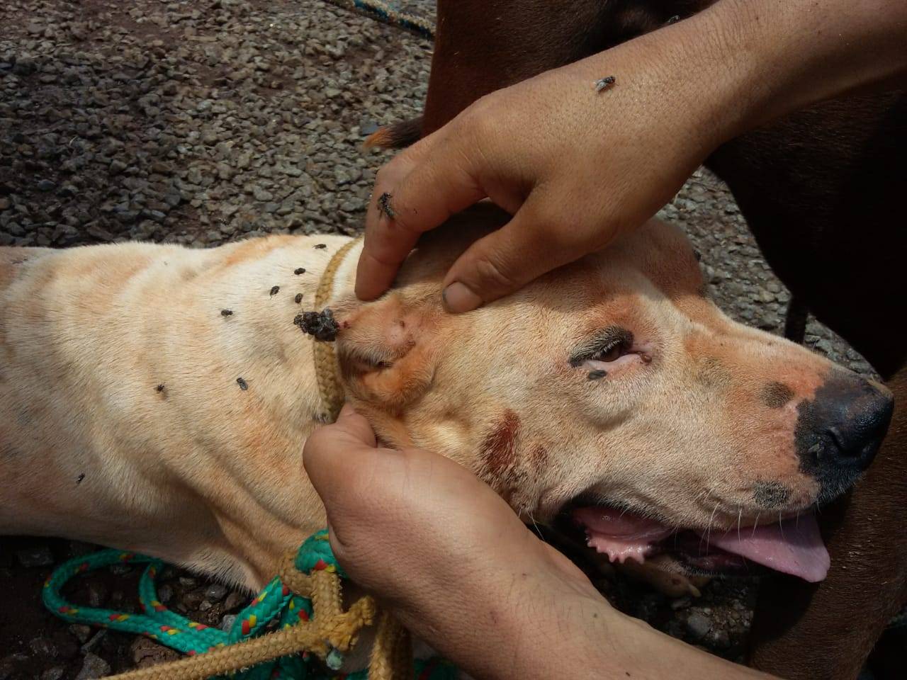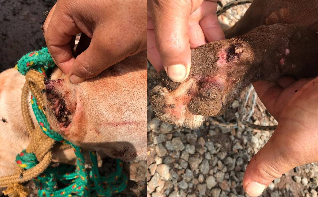 Já os cachorros os policiais puderam constatar que tinham diversos carrapatos em diversas partes do corpo (orelha e ânus principalmente), sujos e com aparente estado de maus-tratos.