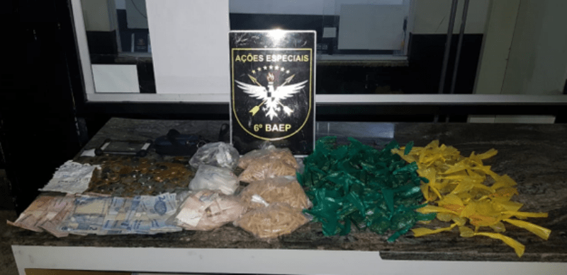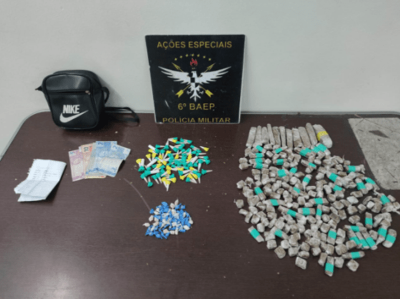 Na busca pessoal foram encontrados R$72,00 em espécie, 75 porções de cocaína, 70 de crack e 60 de maconha. Ao ser questionado sobre os itens, confessou ser o responsável pelas vendas e informou outro local onde foi encontrada uma bolsa com mais 146 porções de maconha, totalizando por volta de 1kg de drogas.