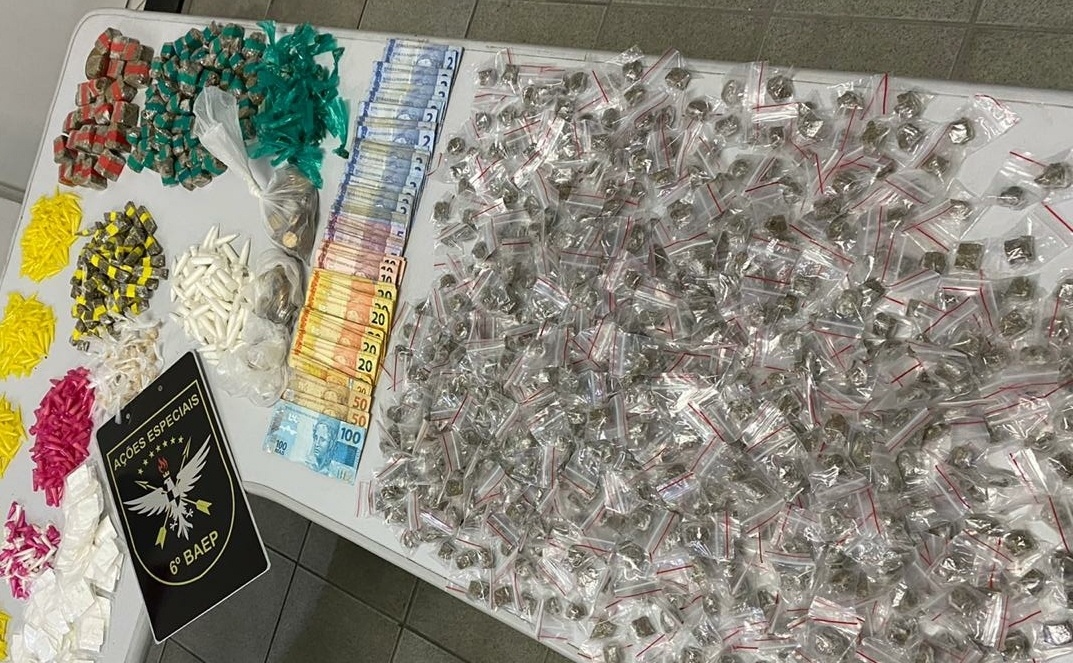 No interior da residência, no quarto, foi localizado outra quantidade de drogas e dinheiro, sendo 657 embalagens de maconha; 592 embalagens de cocaína; 656 embalagens de crack e R$ 1.047,95 (mil e quarenta e sete reais e noventa e cinco centavos). Totalizando 755 unidades de maconha (peso bruto 2.220 kg); 692 unidades de cocaína (peso bruto 645 gramas) e 806 unidades de crack (peso bruto 535 Gramas).