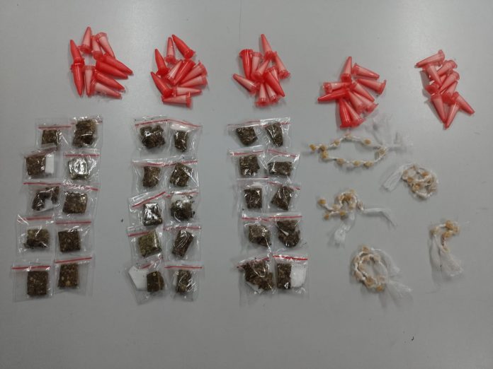 Em revista pessoal foram encontrados apenas 2 pinos de cocaína, porém ao ver o conteúdo da sacola foi encontrado mais 49 pinos de cocaína, 30 buchas de maconha e mais 46 pedra de crack, todas embaladas individualmente prontas para a comercialização.