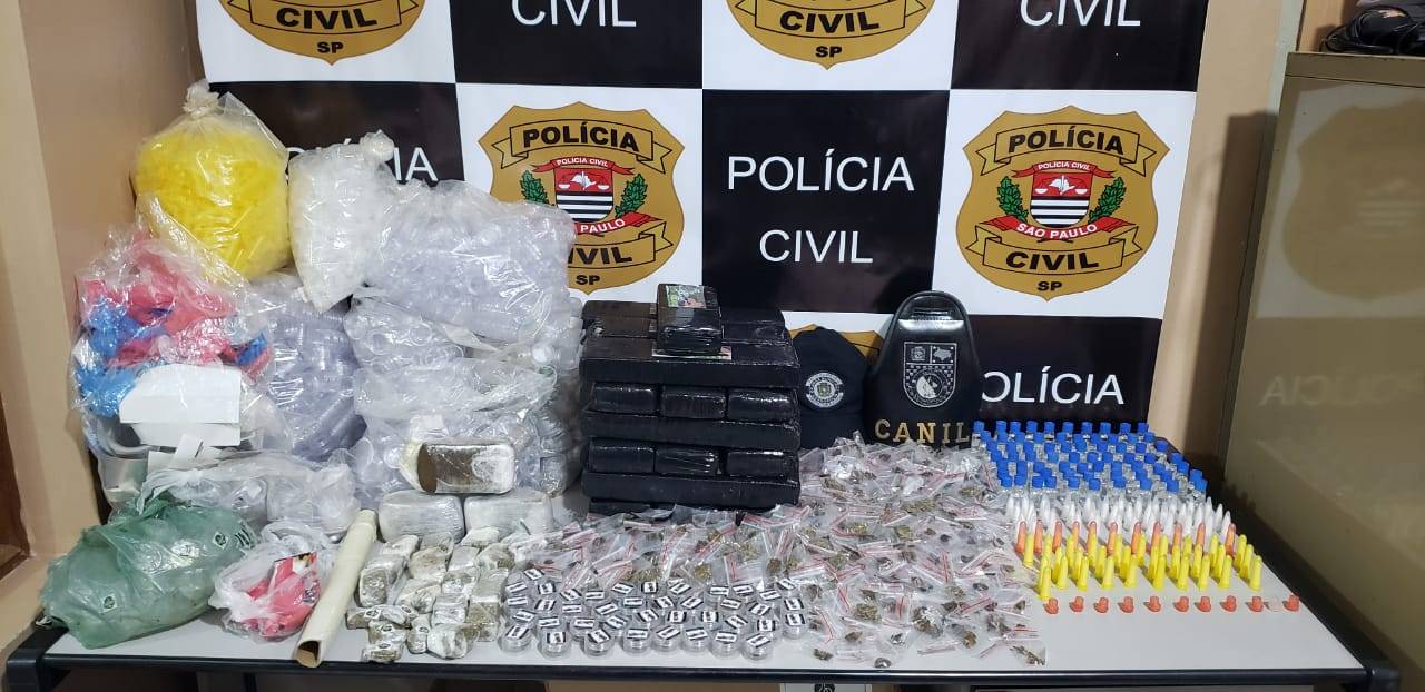 Ainda pelo local foram apreendidas 4.713 embalagens plásticas, diversas embalagens do tipo “sacolé” e selos de identificação. No total foram apreendidos 15.580 (quinze mil, quinhentos e oitentas) gramas de “maconha”, 780 (setecentas e oitenta) gramas de “haxixe”, 135 (cento e trinta e cinco) gramas de “cocaína”, 5 (cinco) gramas de “crack” e 207 ml de “lança-perfume”. Todo o material foi apreendido em Auto próprio.