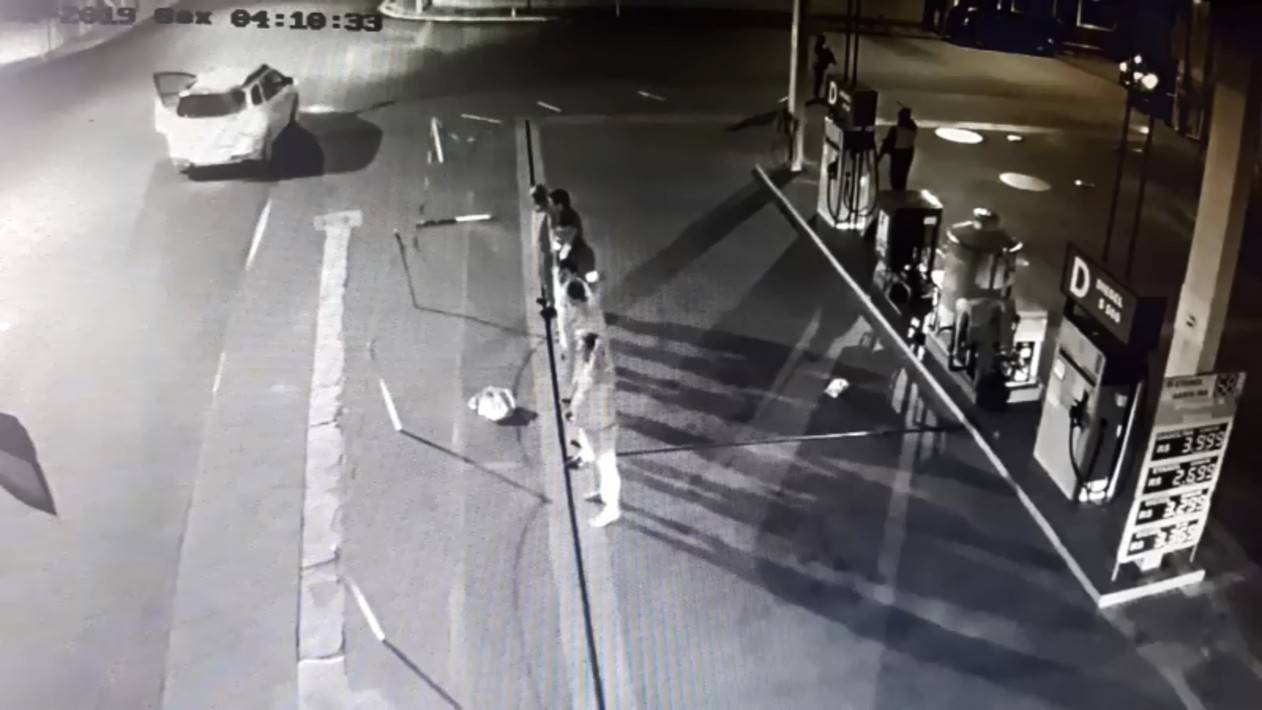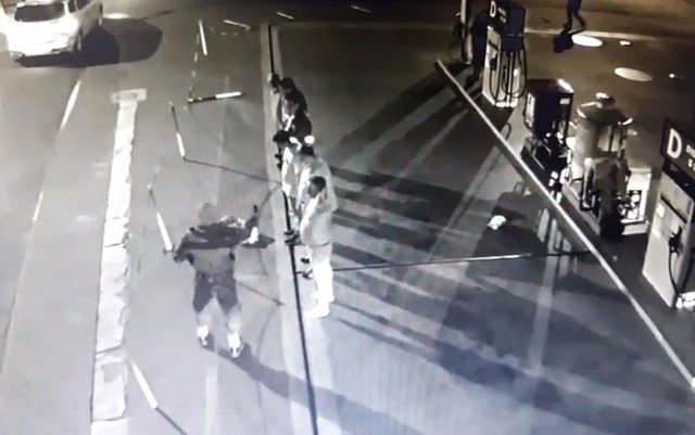 Imagens da câmera de segurança mostram as pessoas em fila no posto, rendidas por um dos criminosos, que estava encapuzado e armado. Sete pessoas foram feitas reféns no local por cerca de meia hora.