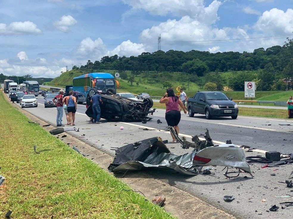 Às 16h15 a pista seguia interditada para retirada dos veículos da pista. Um carro que seguia para o litoral norte invadiu a pista contrária e bateu de frente contra dois carros. Com a batida, os três veículos ficaram destruídos. Equipes da concessionária Ecopista (responsável pelo trecho), do Corpo de Bombeiros e do Serviço de Atendimento Móvel de Urgência foram ao local para prestar atendimento às vítimas. Segundo os bombeiros, um homem de 56 anos morreu na hora. O veículo dele tinha placas de Paraibuna.