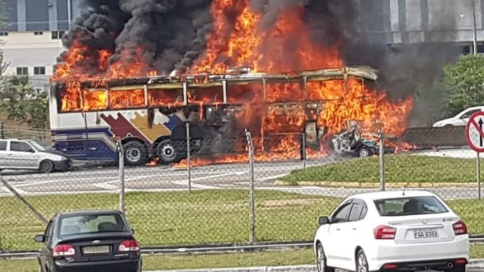 Devido ao impacto da batida, dois carros e o ônibus pegaram fogo; engavetamento causou 10 km de lentidão na rodovia.