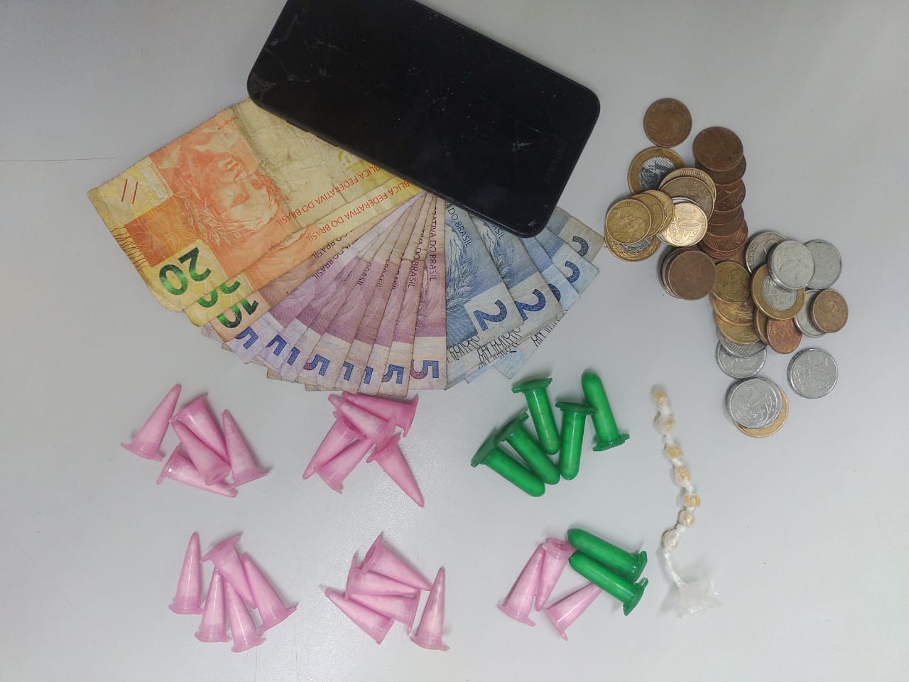 Em busca pessoal foram encontrados com um deles 30 epperndorfes de cocaína, 7 pedras de crack e R$ 63,95, já com o outro adolescente foi encontrado apenas R$ 61,00. A ação contou com apoio do sargento Prado e soldado Jordano.