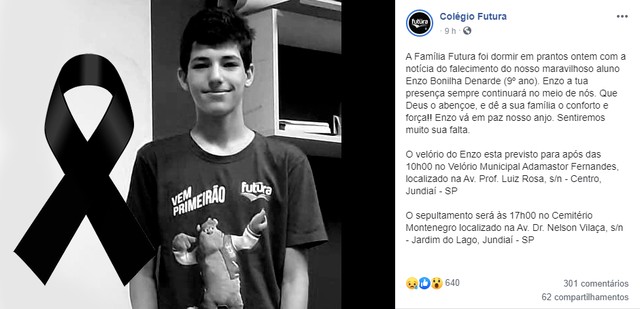 O colégio onde Enzo cursava o 9º ano do ensino fundamental postou um depoimento em homenagem a ele nas redes sociais: “Enzo, a tua presença sempre continuará no meio de nós. […] Sentiremos muito a sua falta”, diz a postagem.