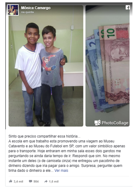 Em menos de 24 horas a postagem feita em uma rede social teve mais de 2,7 mil curtidas e mais de 700 compartilhamentos. A excursão – para o museu Catavento e para o Museu do Futebol em São Paulo – foi planejada pela escola municipal Francisco Murilo Pinto em maio. Cada aluno pagou R$ 45 para o transporte, que poderia ser parcelado em até quatro vezes.