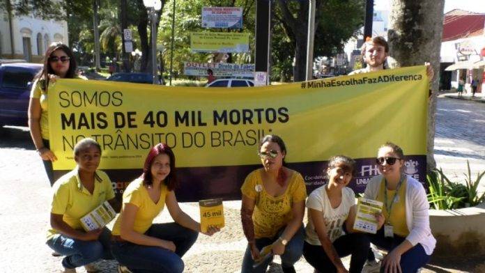 Na manhã desta terça-feira (8), um grupo de alunos da FHO/Uniararas se reuniu na Praça Barão de Araras, no Centro da cidade, para uma panfletagem da Campanha “Maio Amarelo – Trauma – A morte que pode ser evitada”, cujo objetivo é promover a prevenção de acidentes de trânsito.