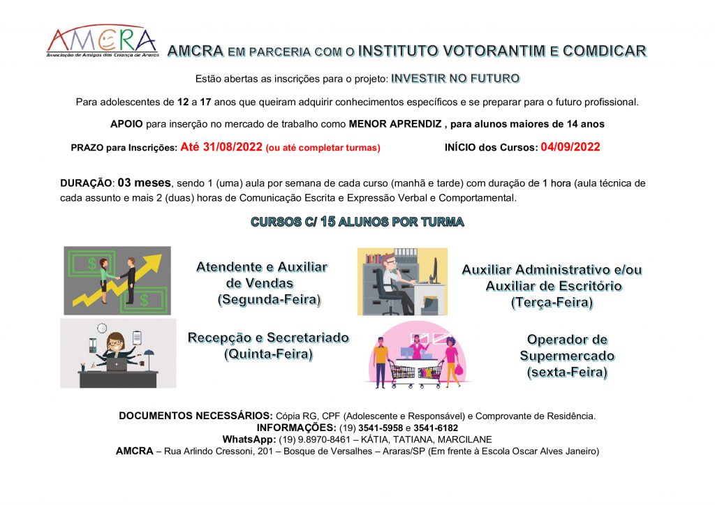 AMCRA – Associação de Amigos das Crianças de Araras (SP), em parceria com o Instituto Votorantim e COMDICAR – Conselho Municipal dos Direitos da Criança e do Adolescente, orgão vinculado a Secretaria Municipal de Assistência Social, estão com inscrições abertas para o projeto “Investir no Futuro”.