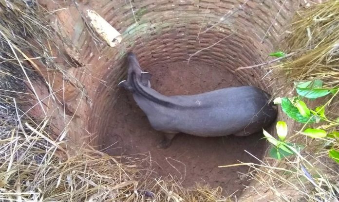 Uma anta com cerca de 200 kg foi resgatada no início da manhã desta sexta-feira (4), depois de cair em um poço desativado de uma casa, no distrito de Arapuá, em Três Lagoas, região leste de Mato Grosso do Sul.