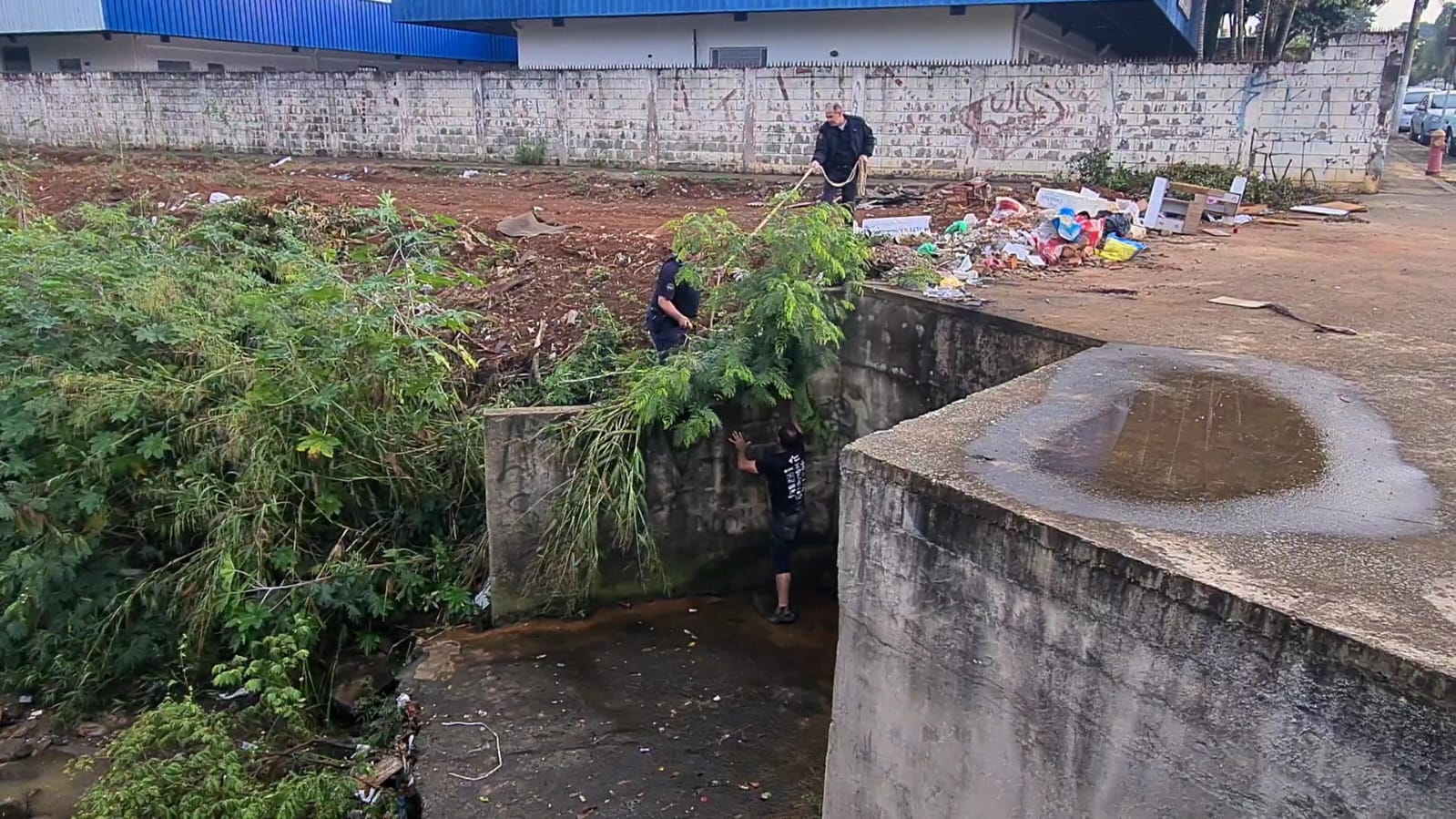 De posse de uma corda, os guardas juntamente com um munícipe conseguiram resgatar o homem de 52 anos que não se lembrava como caiu, somente alegou que na noite de ontem estava indo para casa de um amigo e nesta manhã se deu conta que estava neste local.