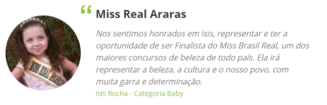 A cidade de Araras (SP), estará sendo representada em um dos maiores concursos de beleza do país, o Miss Brasil Real. A Isis Rocha, Miss Real Araras 2021, na categoria Baby, foi a escolhida através de seletiva que aconteceu de forma online, passou por diversas etapas, onde teve que participar de diversos testes de fotos e vídeos, onde foi avaliada por um júri técnico, sendo a preferida pela organização do concurso para receber o título.