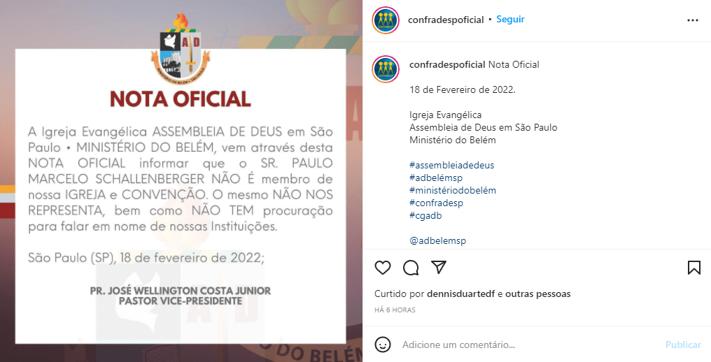 A Assembleia de Deus Ministério do Belém em São Paulo publicou um comunicado oficial nas redes sociais informando que o pastor Paulo Marcelo Schallenberger não é membro da igreja, tampouco da Convenção das Assembleias de Deus. A nota foi publicada nesta sexta-feira (18), algumas horas após o jornal O Globo publicar uma entrevista com Schallenberger o associando à instituição religiosa.