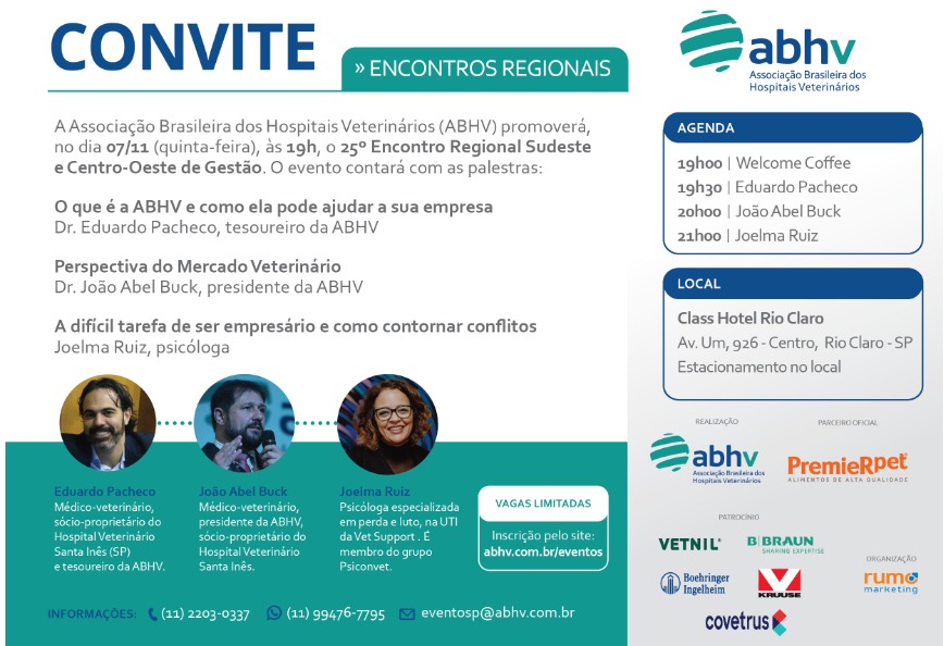 A Associação Brasileira dos Hospitais Veterinários (ABHV) promoverá, no dia 07/11 (quinta-feira), às 19h, o 25º Encontro Regional Sudeste e Centro-Oeste de Gestão na cidade de Rio Claro (SP).