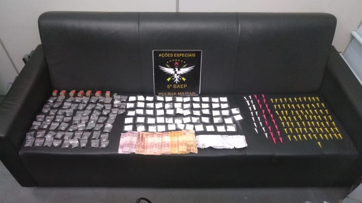Ao recuperar a bolsa dispensava pelo acusado, ainda foram encontrados 96 supositórios de crack, 57 papelotes de cocaína e 73 de maconha, que estavam fracionadas e embaladas já prontas para comercialização.