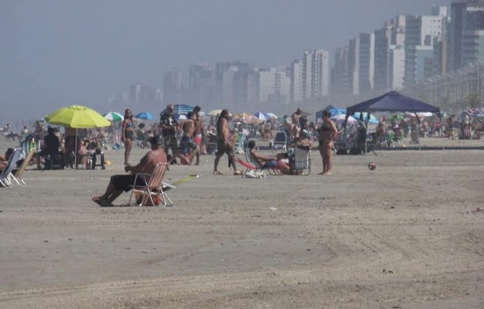 Centenas de pessoas, muitas sem máscaras e promovendo aglomerações, lotaram a orla de Praia Grande neste sábado. Temperatura chegou a 32ºC.