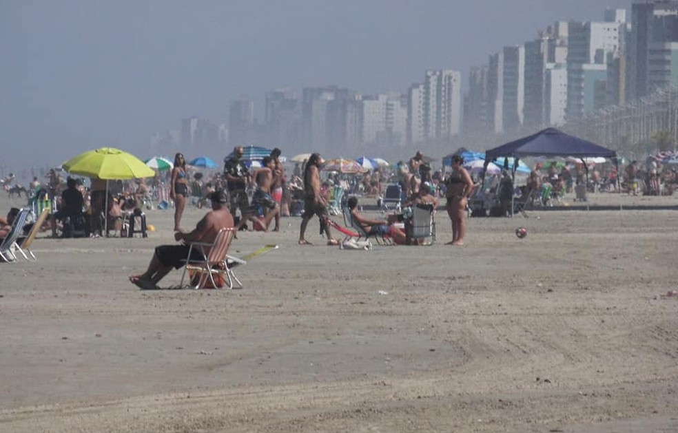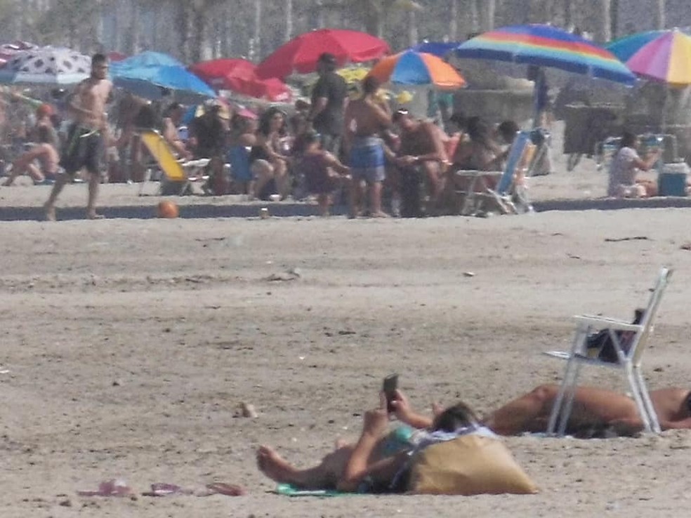 Centenas de banhistas lotaram a faixa de areia na orla de Praia Grande, no litoral de São Paulo, aproveitando o dia ensolarado neste sábado (25). Com guarda-sóis e cadeiras, moradores aproveitaram para caminhar e tomar sol, apesar da proibição de acesso às praias da cidade, com exceção para a prática de atividades aquáticas e em horários restritos.