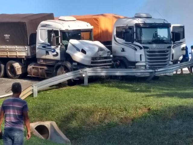 Segundo a polícia, as carretas bateram de lado e foram parar no acostamento, atingindo a grade de proteção. Duas pessoas tiveram ferimentos leves.
