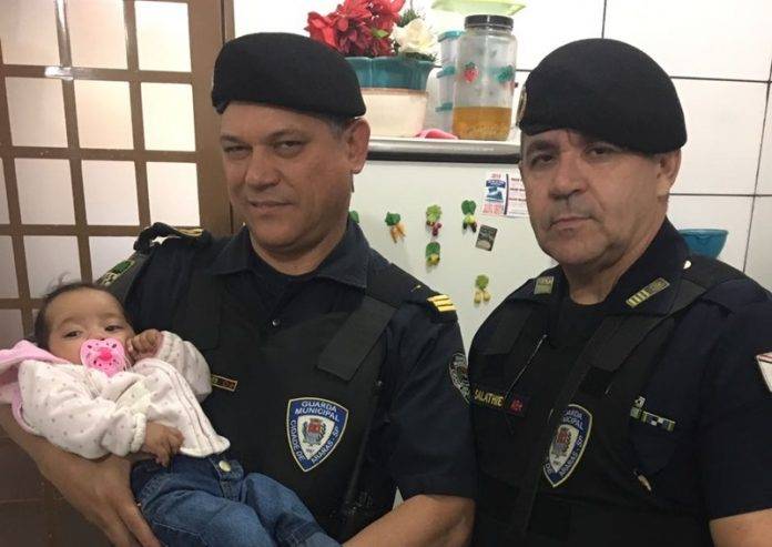 Guardas Civis Municipais da ROMU, recebem visita da bebê que fizeram o parto em Araras, SP