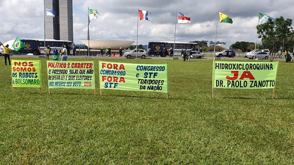Embora o presidente possa não ter avistado, havia faixas com dizeres “Fora Congresso” e “Fora STF”. Também havia faixas de protesto contra os presidentes da Câmara, Rodrigo Maia (DEM-RJ), do Senado, Davi Alcolumbre (DEM-AP) e contra ministros do Supremo Tribunal Federal.