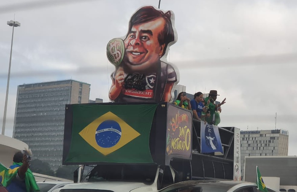 No trio que acompanhou o percurso, os organizadores colocaram um boneco inflável com o rosto do presidente da Câmara, Rodrigo Maia (DEM-RJ), que segurava um símbolo de dinheiro, vestia uma camisa com o escudo do Botafogo e a logomarca da empresa Odebrecht. Na última quinta-feira, Bolsonaro recebeu Maia no Palácio do Planalto.