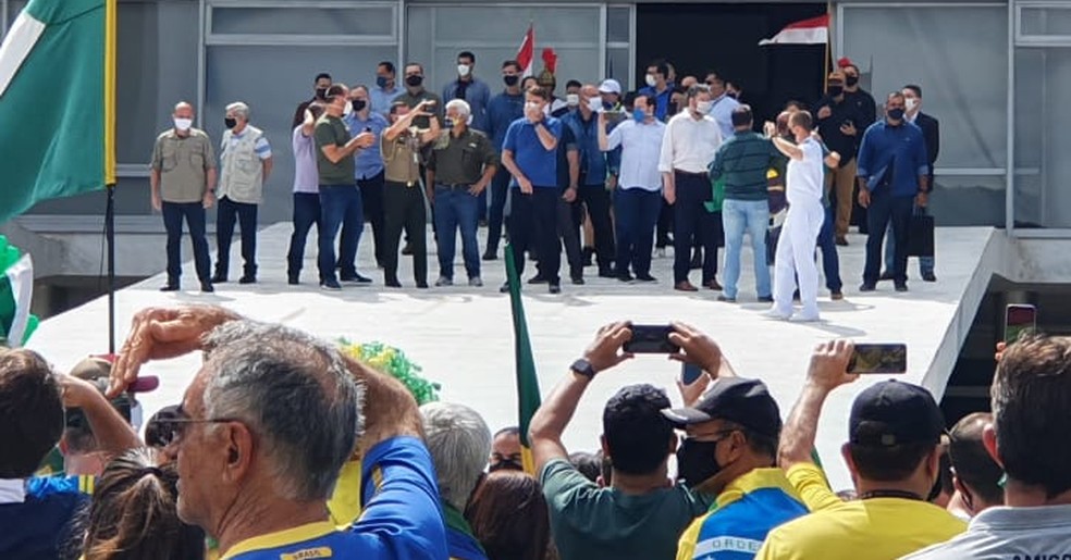 De máscara e ao lado dos ministros e de parlamentares, Bolsonaro acompanhou a manifestação do alto da rampa do Planalto. Entre os ministros, estavam Augusto Heleno (Gabinete de Segurança Institucional), Onyx Lorenzoni (Cidadania), Luiz Eduardo Ramos (Secretaria de Governo), Rogério Marinho (Desenvolvimento Regional), Marcos Pontes (Ciência e Tecnologia), Abraham Weintraub (Educação), Bento Albuquerque (Minas e Energia), Tereza Cristina (Agricultura), Ernesto Araújo (Relações Exteriores), Jorge Oliveira (Secretaria-Geral) e André Mendonça (Justiça e Segurança). O presidente chegou a levantar as mãos de alguns dos ministros.