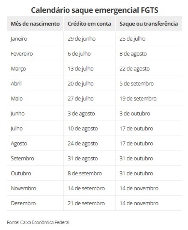 Para evitar aglomerações nas agências, a Caixa fixou datas diferentes para a liberação do crédito em conta e para o saque em espécie ou transferência dos valores. O calendário considera o mês de nascimento do trabalhador. Veja as datas a seguir: