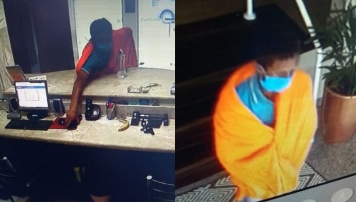 Pelas imagens podemos ver que ele passa em frente ao local, e ao notar que não havia ninguém naquele momento na recepção, adentra observando se alguém notou sua presença, debruça no balcão e furta o celular.