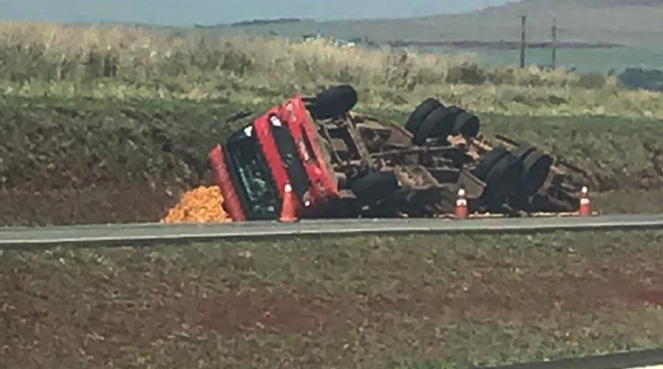 Um caminhão Mercedes-Benz (truck) carregado com laranjas tombou na manhã desta quinta-feira (24), no acostamento da Rodovia dos Bandeirantes (SP-348), na altura da cidade de Limeira (SP).
