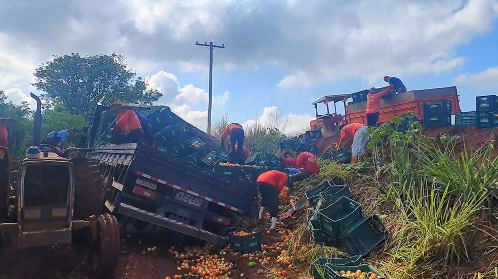 Um caminhão carregado com tomates tombou em uma estrada rural, na manhã desta quarta-feira (21), em Sumaré (SP). O acidente aconteceu na Avenida Ivo Trevisan, próximo à propriedades da região.