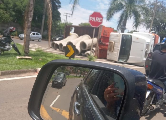 Por motivos que estão sendo apurados, um caminhão carregado com tubos de concreto, tombou no início da tarde desta segunda-feira (6), na rotatória perto da sede da Guarda Civil Municipal de Araras (SP).