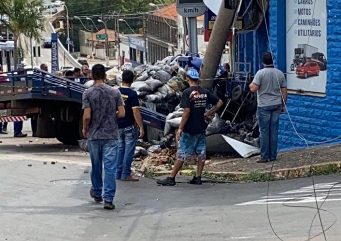 De acordo com informações da corporação e da Guarda Municipal, o caminhão descia a avenida carregado com sacos de cimento quando perdeu o freio, colidiu com o poste e parou em frente à fachada de uma loja, que não chegou a ser atingida.