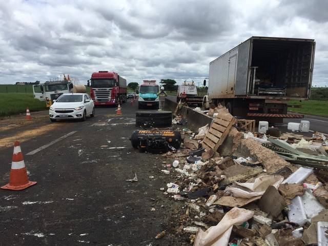 O caminhão teria invadido a pista contrária e acabou tombando. O veículo foi retirado da rodovia para o acostamento, mas a carga continua na pista.