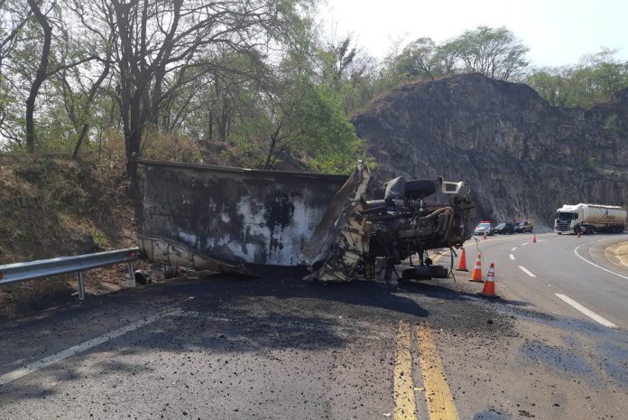 A PRF informou que o veículo transportava uma carga de massa asfáltica, que caiu na pista e no acostamento, da rodovia, que chegou a ficar parcialmente interditada, operando no sistema Pare e Siga, depois já teve o tráfego liberado, segundo a PRF.