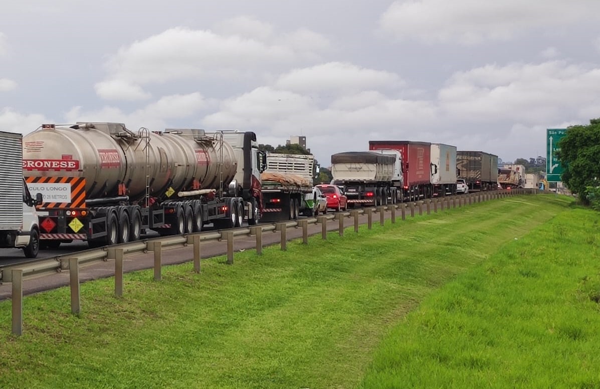 O protesto acontece no quilômetro 188 da via. Manifestantes usam caminhões para bloquear a pista. O local registra início de congestionamento. Somente carro está conseguindo passar. Segundo a Polícia Militar Rodoviária, o bloqueio começou por volta de 14h40, e é feito por caminhoneiros.