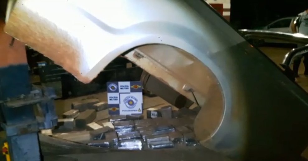 Durante a vistoria foi localizado um fundo falso na carroceria com cocaína. Total de 98,800 kg em 90 tabletes. Ocorrência foi apresentada na Polícia Federal de Jales (SP).