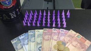 Com os mesmos foram localizados nove (09) pinos de cocaína e a quantia de R$ 39,00 em cédulas diversas.