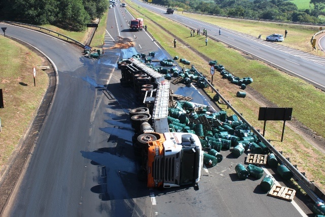 Uma carreta carregada com óleo de laranja tombou na Rodovia Washington Luís (SP-310), em Matão (SP), na manhã deste sábado (16). Ninguém se feriu. O acidente causou um congestionamento de pelo menos 3 quilômetros.