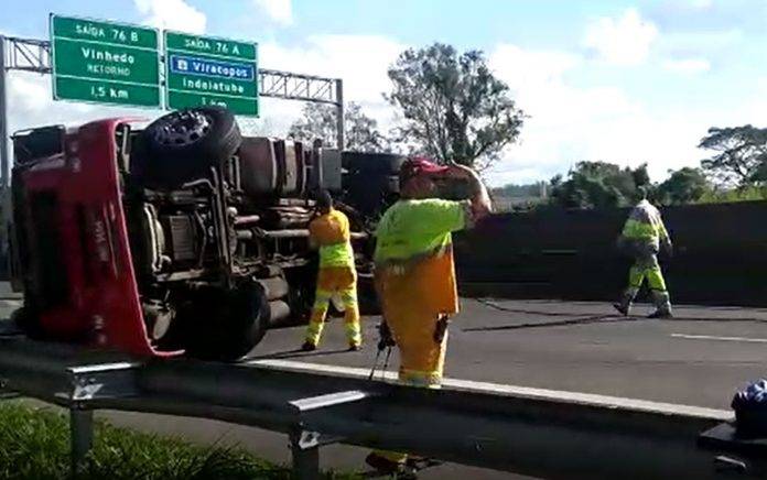 Duas pessoas tiveram ferimentos após uma carreta tombar no km 77 + 100 metros da Rodovia Anhanguera (SP-330), em Vinhedo (SP) por volta das 17h deste sábado (29). Um dos feridos precisou ser levado para a Santa Casa de Vinhedo, o segundo foi liberado.