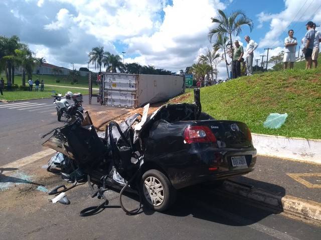 Segundo informações da Polícia Militar, ao fazer a curva de acesso ao trevo o caminhão perdeu o controle e tombou sobre um carro que estava aguardando para entrar na via, jogando-o para o acostamento.