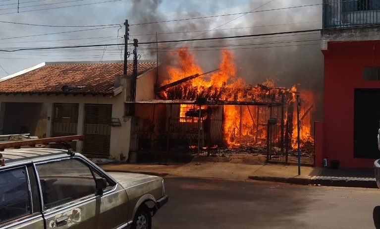 Uma casa de madeira ficou destruída depois de pegar fogo na manhã desta quinta-feira (17) no centro de Bastos (SP). Segundo o Corpo de Bombeiros de Tupã, o fogo começou por volta das 11h30 na rua Rui Barbosa e consumiu rapidamente o imóvel.