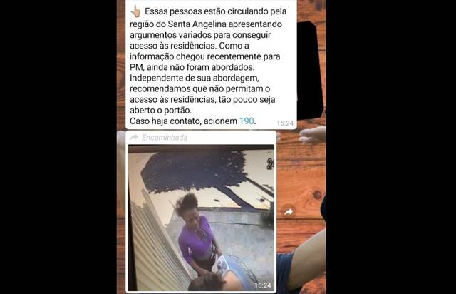 Aline contou que não acreditou quando viu a imagem. Além disso, a mensagem dizia que os dois “estariam circulando pela região do bairro Santa Angelina, apresentando argumentos variados para conseguir acesso às residências, mas que ainda não haviam sido abordados pela PM”.