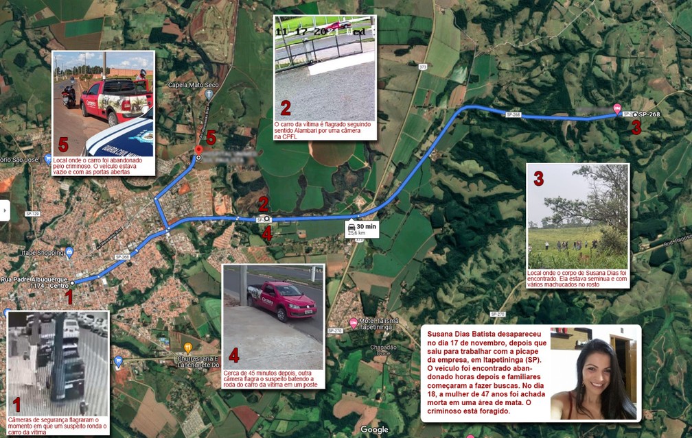No vídeo gravado por uma das câmeras de segurança, por volta das 14h30, é possível ver a picape que Susana utilizava estacionada na Rua Padre Albuquerque, no centro de Itapetininga, e uma possível abordagem. Um homem se aproxima, olha em volta, e aparenta entrar no veículo pela porta do motorista (conforme o vídeo, a ação ficou encoberta por uma placa de publicidade).