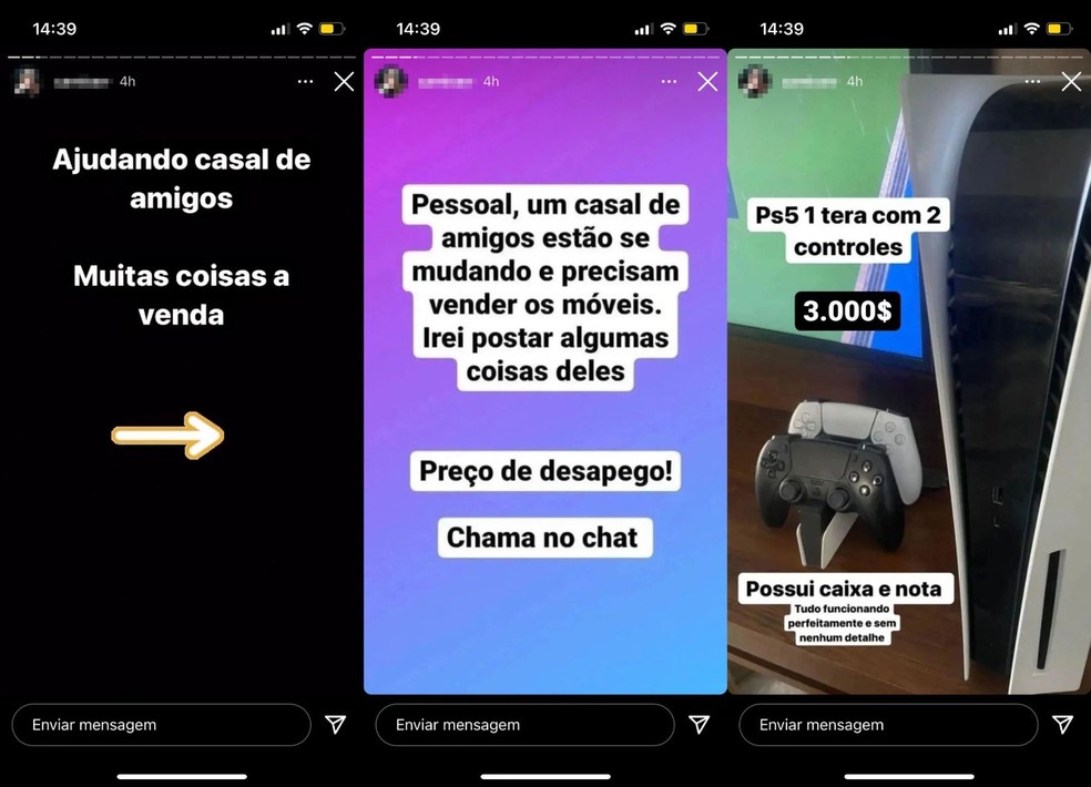 Depois de invadir o perfil de um alvo, os golpistas usam iscas muito parecidas para tentar ganhar dinheiro: eles fazem stories se passando pelo dono da conta avisando que um parente está se mudando do Brasil e, por isso, está vendendo alguns itens como eletrodomésticos ou eletrônicos. Os preços são baixos porque a pessoa precisa agilizar a saída do país.