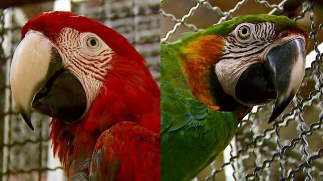 Uma das aves é uma arara vermelha, que está ameaçada de extinção. A outra é uma híbrida, resultado do cruzamento em uma arara vermelha com uma arara Canindé, que tem penas azuis e amarelas.