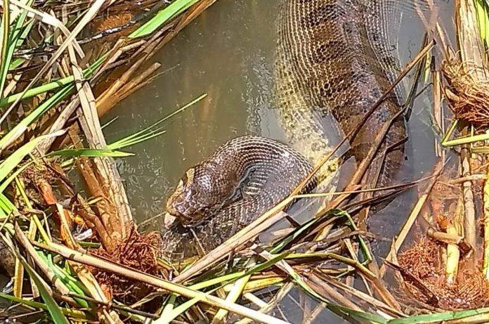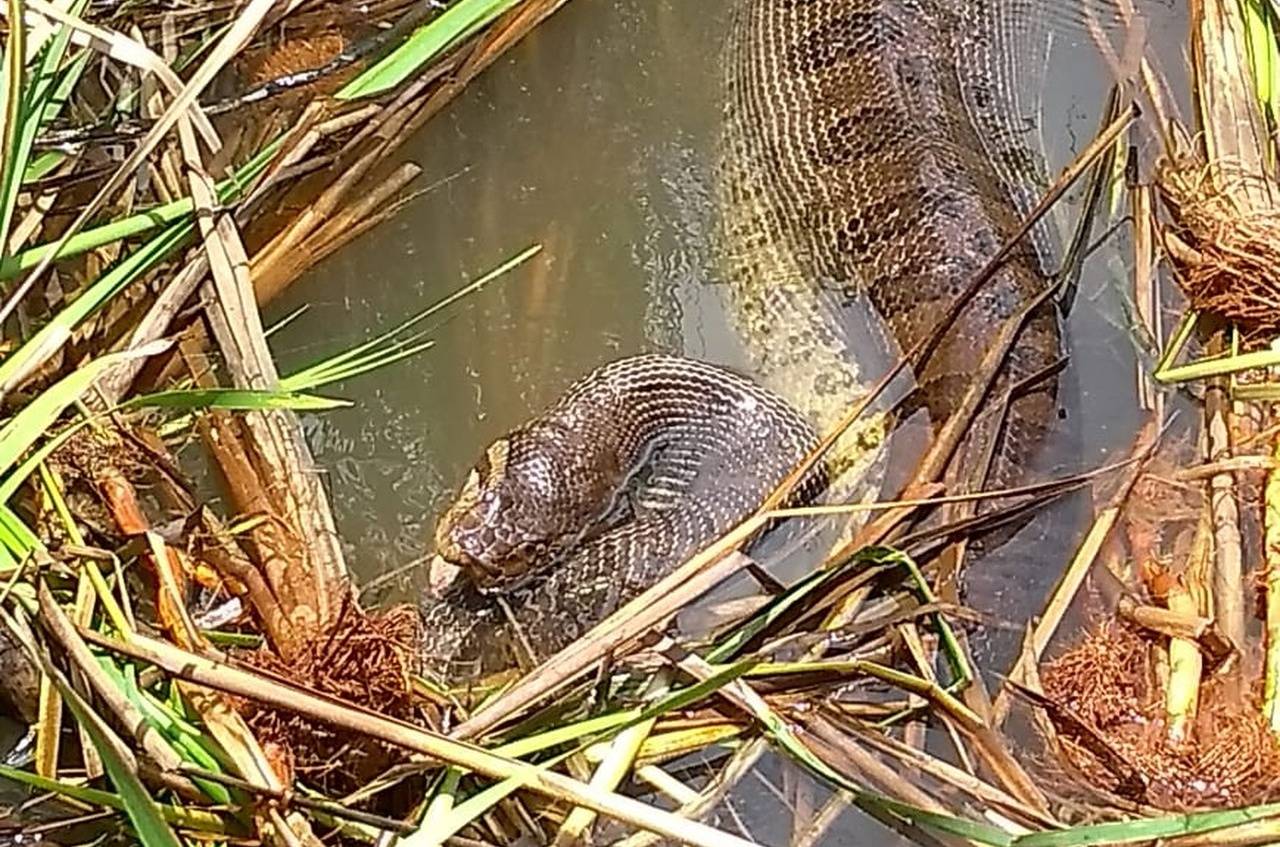 “Foi legal demais ver a cobra lá. Eu já cheguei a ver sucuri de 2 ou 3 metros, filhotão, mas daquele tamanho eu nunca tinha visto. Ver ela em um lugarzinho simples daquele ali, tranquilo e em um espaço muito pequeno para ela foi uma coisa inusitada.”