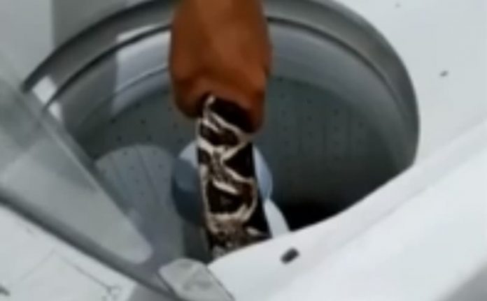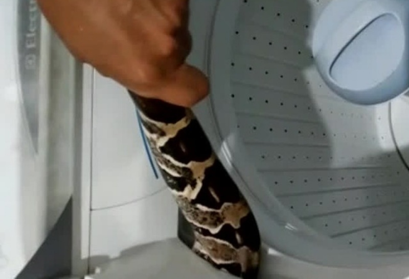Morador estava colocando roupa para lavar, quando notou algo estranho. Com ajuda de vizinho, abriu o equipamento e conseguiu retirar o animal de lá. Segundo biólogo, trata-se de uma jiboia.