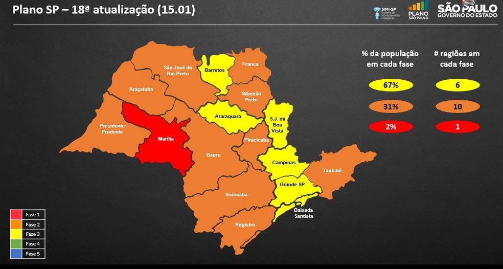 Segundo a última reclassificação do Plano São Paulo, apenas a região de Marília foi rebaixada oficialmente para a fase vermelha. Dez regiões estão atualmente na fase laranja, e outras seis, incluindo a Grande São Paulo, na amarela (veja, abaixo, a lista completa e as regras para cada fase).