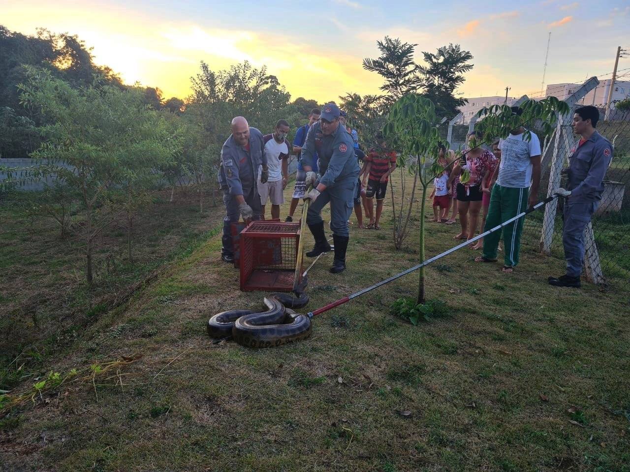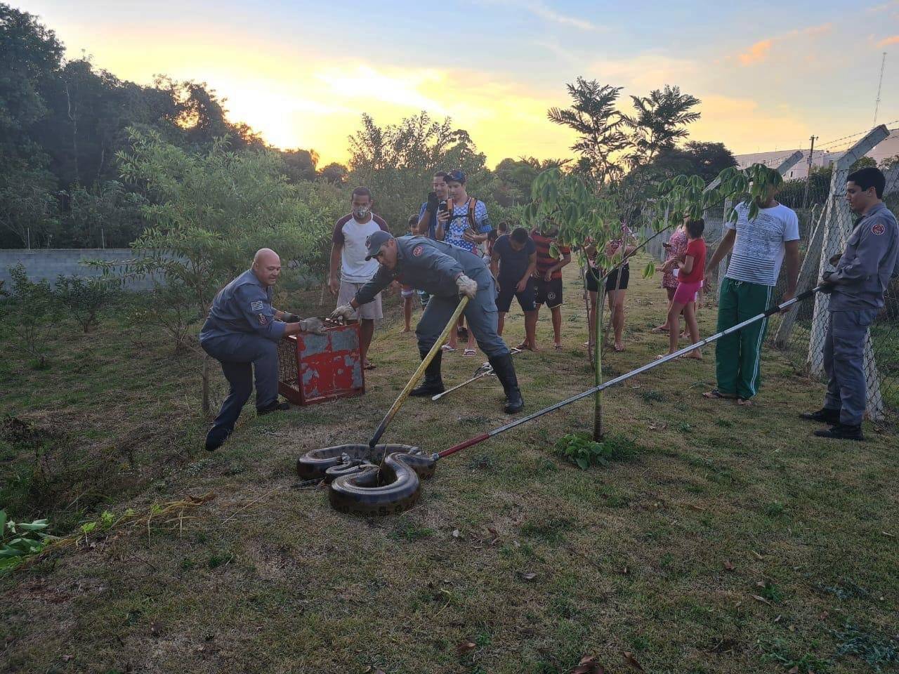 De acordo com moradores que acionaram a corporação, a serpente estava em uma área verde do condomínio. O animal foi resgatado e levado para uma área na zona rural da cidade, na região da Usina São João. As imagens são do leitor Zedequias Felicio.