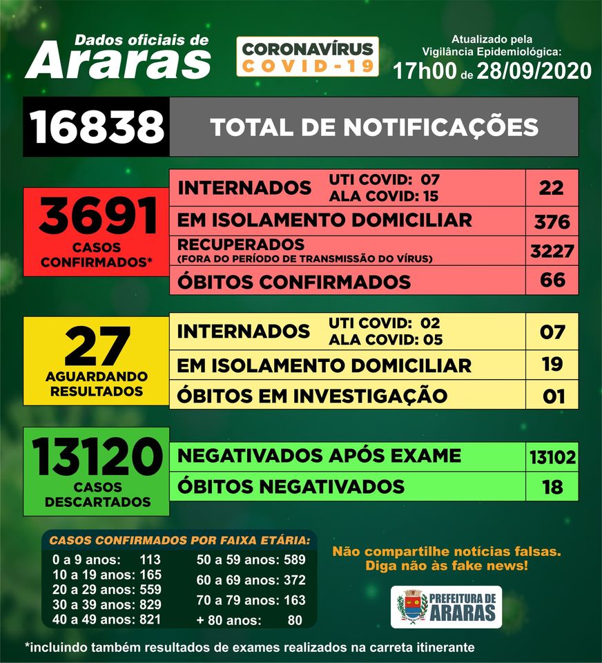 De acordo com dados oficiais e atualizados pela Vigilância Epidemiológica na tarde de segunda-feira (28), o município de Araras (SP) tem atualmente 376 pessoas em isolamento domiciliar, o número de pacientes em isolamento é o maior desde o início da pandemia. 3.227 pessoas já estão recuperadas.